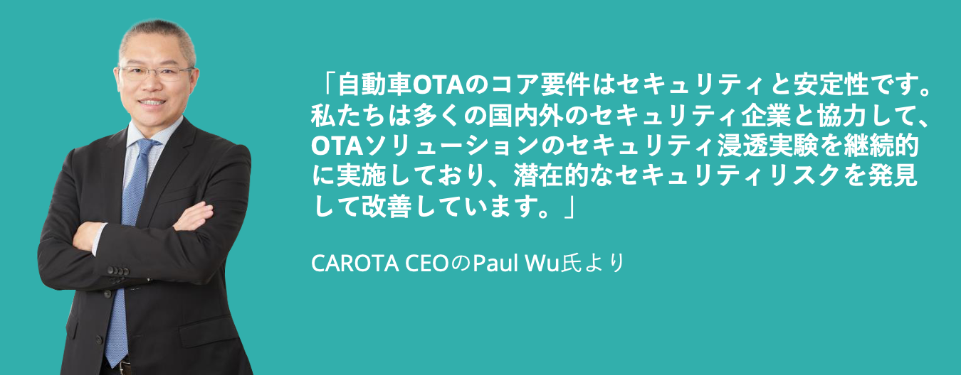 「自動車OTAのコア要件はセキュリティと安定性です。この点で、CAROTAは業界をリードするOTA自動ストレステストシステムを確立しました。私たちは多くの国内外のセキュリティ企業と協力して、OTAソリューションのセキュリティ浸透実験を継続的に実施しています。潜在的なセキュリティリスクを発見して改善しています。」CAROTA CEOのPaul Wu氏は強調しました。